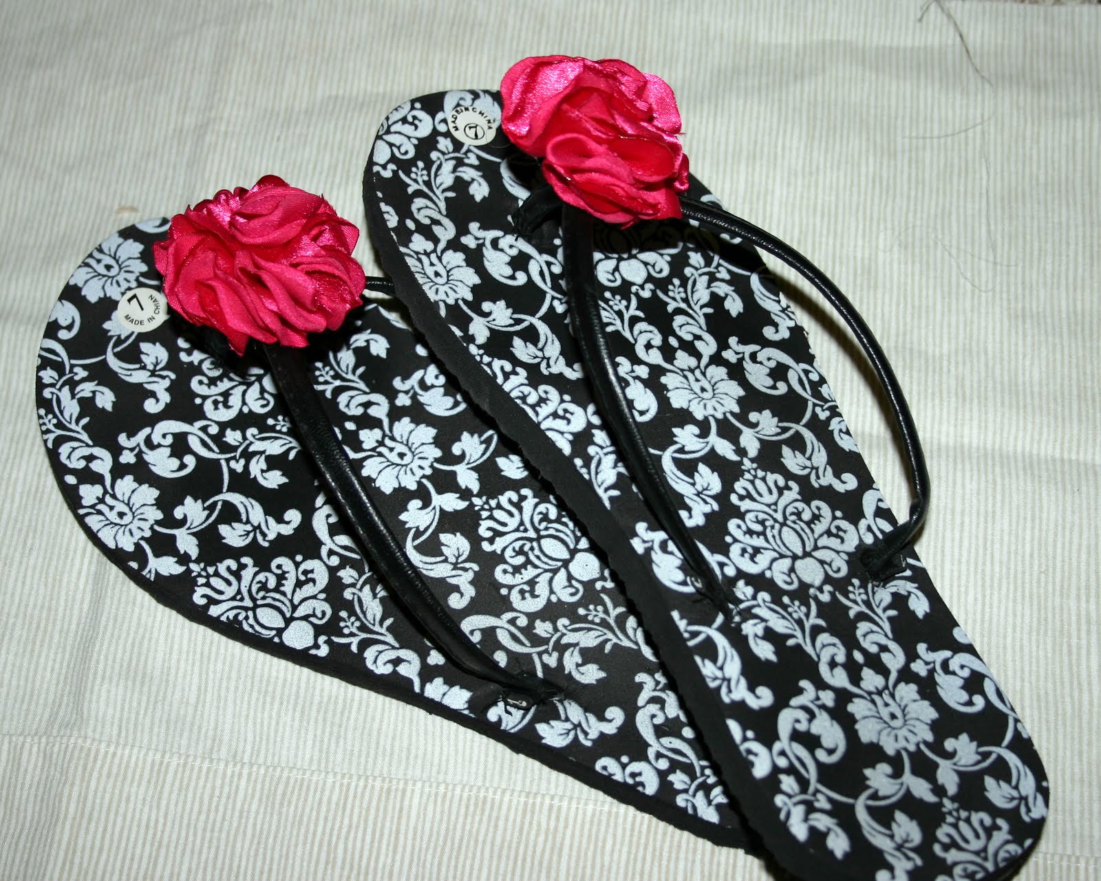 I should mention that the pink ribbon came around a pair of PJ's and the white ribbon came around a stack of wash clothes. The pink satin is left over from Halloween a decade ago. So the total cost for all this cute-$1 (for the flip flops).